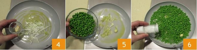 ajoutez une gousse d'ail pelée et entière 4 et faites revenir à feu doux, en mélangeant de temps en temps pour éviter de brûler. Quand l'oignon de printemps est flétri, ajoutez les petits pois dans la poêle 5, salez 6 et poivrez