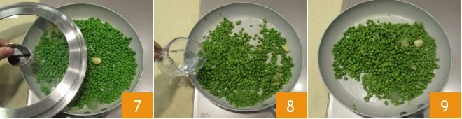 puis couvrez avec un couvercle 7. Poursuivez la cuisson pendant environ 15-20 minutes. Pendant la cuisson, vous pouvez ajouter de l'eau pour éviter que les petits pois ne sèchent trop 8. Une fois cuits 9, éliminez la gousse d'ail