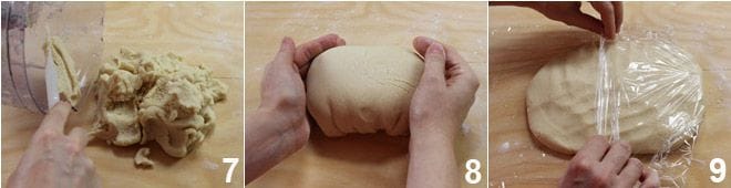 Transférez la pâte sur un plan de travail légèrement fariné 7: elle sera très molle et difficile à travailler, alors compactez-la pour la rendre lisse 8, puis aplatissez-la un peu avec les mains, couvrez-la d'un film plastique 9 et placez-la au réfrigérateur pour la faire durcir pendant au moins une demi-heure (ou au congélateur pour accélérer le processus).