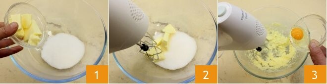 Pour préparer les biscuits au miel et aux graines de pavot, placez dans un grand bol le sucre en poudre et le beurre à température ambiante coupé en morceaux 1. Mélangez avec un batteur électrique 2, puis ajoutez l'œuf entier à température ambiante 3.