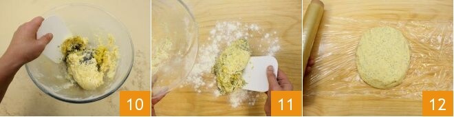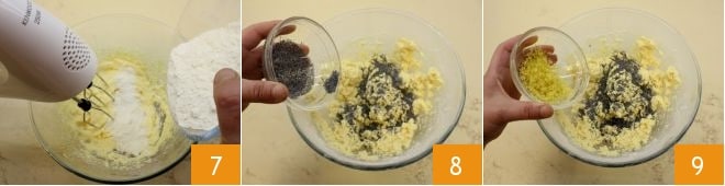 Ajoutez petit à petit les poudres tamisées au mélange de sucre et de beurre 7 et mélangez pour obtenir une pâte claire et mousseuse ; ajoutez les graines de pavot 8 et le zeste de citron râpé 9.
