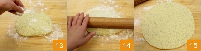 Après le temps de repos, placez la pâte sur un plan de travail fariné ; saupoudrez-la d'un peu de farine 13 pour éviter qu'elle ne colle, et à l'aide d'un rouleau à pâtisserie, étalez-la 14 à une épaisseur de 5 mm 15.