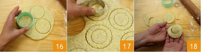 Prenez un emporte-pièce de 7 cm de diamètre et découpez des disques 16 : avec nos doses, vous devriez obtenir environ 30 biscuits. Avec un emporte-pièce de 4,5 cm, découpez le centre de chaque disque pour créer des cercles plus petits 17. Avec les mains, retirez délicatement les petits disques intérieurs 18 et reformez-les pour former une boule ; couvrez à nouveau de film plastique et laissez reposer au réfrigérateur pendant au moins 15 minutes, puis répétez l'opération jusqu'à épuisement de la pâte.