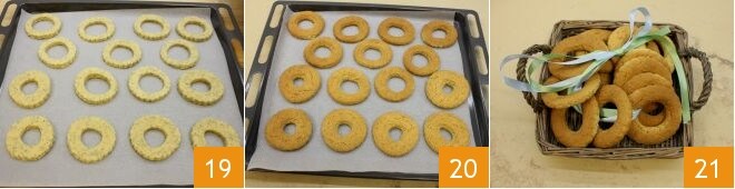 Placez les biscuits obtenus sur une plaque recouverte de papier sulfurisé 19 et faites cuire dans un four statique préchauffé à 180°C pendant 13-15 minutes (ou à 160°C pendant 8-10 minutes si en four ventilé). Une fois bien dorés 20, sortez-les du four et laissez-les refroidir sur une grille. À ce stade, vous pouvez servir et déguster vos biscuits au miel et aux graines de pavot 21.