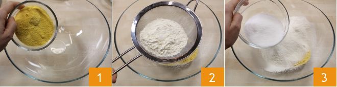 Pour réaliser les biscuits de meliga : placez dans un bol la farine de maïs fioretto 1, la farine type 00 tamisée 2, une pincée de sel, les graines d'une demi-gousse de vanille et le sucre semoule 3.