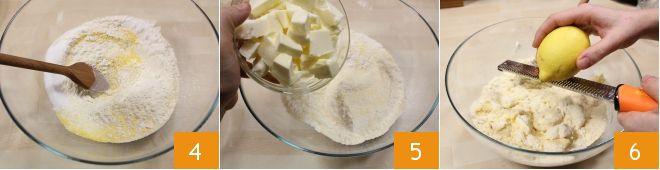 Avec une cuillère en bois, mélangez bien les poudres 4 ; puis ajoutez le beurre ramolli coupé en morceaux 5 et râpez le zeste d'un citron dans la pâte 6. Mélangez bien pour amalgamer les ingrédients.