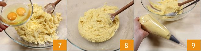 Ajoutez l'œuf et le jaune et incorporez-les bien au mélange 7, en mélangeant avec une cuillère en bois : vous devez obtenir une pâte crémeuse, douce et homogène 8. Transférez la pâte dans une poche à douille avec une douille étoile 9.