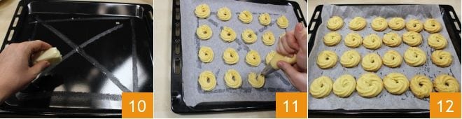 Beurrez les côtés et le centre d'une plaque 10 et tapissez-la de papier cuisson ; pressez directement dessus la pâte de la poche à douille, en formant de petites couronnes rondes 11. Faites cuire au four statique à 180° pendant 15/20 minutes, jusqu'à ce que les biscuits soient bien dorés 12. Voici vos biscuits de meliga prêts 12.