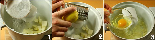 Réduisez le beurre en dés et, à l'aide des fouets d'un batteur ou d'un robot, mélangez-le avec le sucre 1 et le zeste de citron râpé 2, jusqu'à obtenir une belle crème lisse.