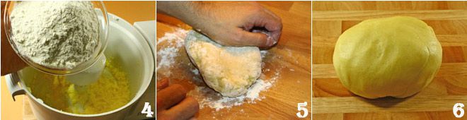 Ajoutez à la crème les œufs (1 entier + 1 jaune) 3, un à la fois et, sans trop battre, incorporez le sel et enfin la farine tamisée avec la levure 4. Mélangez bien le tout et transférez la pâte sur le plan de travail 5, où vous la travaillerez jusqu'à obtenir une pâte lisse et homogène 6.
