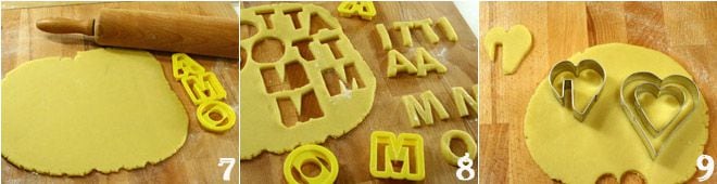 Enveloppez la pâte dans du film plastique et placez-la au réfrigérateur pendant une demi-heure. Une fois le temps écoulé, prenez la pâte, étalez-la avec le rouleau à pâtisserie sur le plan de travail fariné 7 pour former une feuille d'environ 4 mm d'épaisseur ; avec des emporte-pièces, découpez les lettres de l'alphabet 8 qui forment les mots "je t'aime", mais aussi "Saint-Valentin", "amour" et tous les mots qui vous viennent à l'esprit et qui pourraient convenir à l'occasion, comme le nom de votre partenaire. Avec des emporte-pièces en forme de cœur, découpez des biscuits classiques ainsi que ceux à accrocher sur les bords des tasses 9 ; si vous n'avez pas l'emporte-pièce approprié, retirez vous-même avec un petit couteau à lame lisse un rectangle de pâte comme sur la photo.