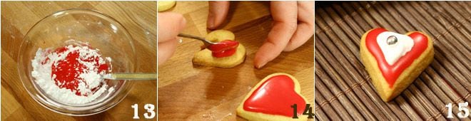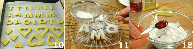 Tapissez plusieurs plaques de cuisson de papier sulfurisé et disposez les biscuits en les espaçant de quelques centimètres les uns des autres 10. Faites cuire dans un four préchauffé à 170° pendant environ 15 minutes. Une fois sortis du four, saupoudrez les lettres de sucre glace 11 et préparez le glaçage coloré pour couvrir les petits cœurs avec du sucre glace, du colorant et de l'eau chaude 12. Mélangez bien le tout avec une cuillère 13.