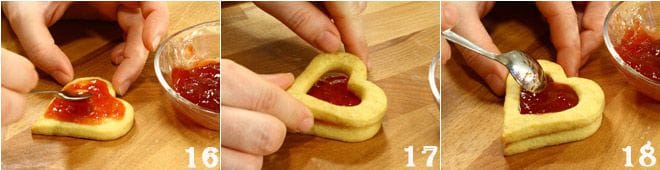Une autre idée pourrait être de remplir deux silhouettes en forme de cœur avec de la confiture de fraises. Prenez la silhouette entière et étalez-la avec de la confiture 16, recouvrez-la avec l'autre silhouette et remplissez ensuite le trou central avec de la confiture supplémentaire 18.