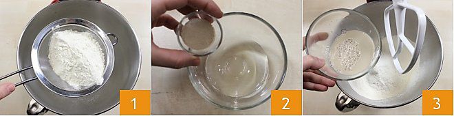 Pour réaliser les biscottes, prenez le bol d'un robot pâtissier muni d'une feuille, tamisez les farines 1, dissolvez la levure dans l'eau tiède (vous pouvez également utiliser 15 g de levure de boulanger fraîche) 2 et ajoutez-la aux farines 3; si vous ne disposez pas de robot pâtissier, vous pouvez pétrir à la main en vous aidant initialement d'une fourchette pour mélanger les farines aux liquides).