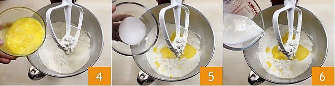 Ajoutez également les œufs battus 4, le sucre 5 et le lait tiédi 6. Pétrissez bien pendant environ 15 minutes, jusqu'à obtenir une pâte homogène. Si nécessaire, arrêtez et retournez la pâte plusieurs fois.