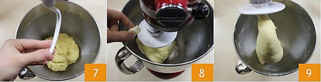 À ce stade, remplacez la feuille par le crochet 7 et ajoutez le sel et le beurre mou, un cube à la fois 8, en attendant que le premier soit absorbé avant d'ajouter le suivant. Lorsque la pâte sera lisse et élastique (cela prendra environ 20 minutes) 9