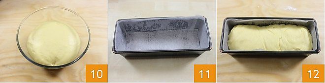 formez une boule 10, placez-la dans un bol couvert de film plastique pendant 30 minutes dans le four éteint (la température doit être d'environ 25°-26°). Passé ce temps, chemisez un moule à cake de dimensions 28 x11 (h 7 cm) avec du papier sulfurisé 11, beurrez légèrement le moule et découpez un rectangle de 28x11 cm, qui couvrira le fond du moule, et une bande de 7 cm de haut et 78 cm de long pour les parois, faites bien adhérer le papier sulfurisé au moule pour éviter que des plis se forment. Reprenez la pâte, aplatissez-la avec les mains et roulez-la sur elle-même. Placez-la dans le moule 12 et laissez lever dans le four éteint avec la lumière allumée