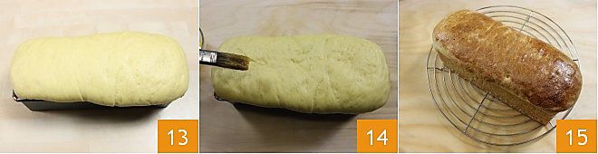 jusqu'à ce que la pâte atteigne le bord du moule 13 (cela prendra environ 50 minutes). Enfin, badigeonnez la pâte avec l'œuf battu 14 et enfournez dans un four déjà chaud à 180° pendant 40 minutes. Laissez tiédir, démoulez et laissez refroidir sur une grille 15.