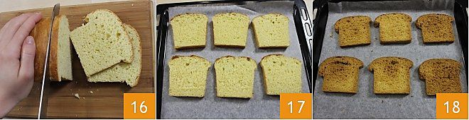 Une fois froid, découpez des tranches 16 d'environ 1/2 cm d'épaisseur (ou 1 cm, selon les goûts), placez-les sur une plaque recouverte de papier sulfurisé 17 et enfournez dans un four statique déjà chaud à 150° pendant environ 1h, ou dans un four ventilé à 130° pendant 45 minutes, ou jusqu'à ce qu'elles soient sèches et aient une couleur brunâtre 18. Sortez-les du four, laissez-les refroidir sur une grille. Vos biscottes sont prêtes à être dégustées avec les confitures de votre choix !