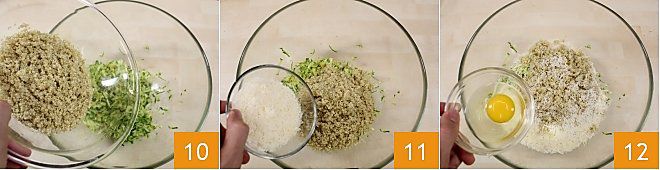 Ajoutez le quinoa cuit aux courgettes râpées, le gingembre et le zeste de citron 10, ajoutez également le Grana Padano râpé 11 et l'œuf 12. Assaisonnez de sel et de poivre selon votre goût et mélangez les ingrédients jusqu'à obtenir un mélange homogène.