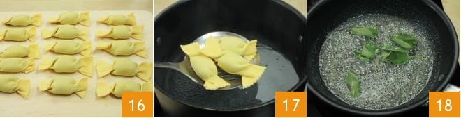 Une fois que vous avez façonné tous les bonbons, disposez-les sur une planche à découper farinée et laissez-les sécher pendant environ une heure 16. Faites cuire la pâte dans de l'eau bouillante salée pendant au moins 5 minutes 17, pendant ce temps, faites dorer les feuilles de sauge dans le beurre fondu 18. Une fois cuits, égouttez les bonbons et assaisonnez-les avec le beurre et la sauge et du parmesan râpé à votre goût. Vos bonbons à la ricotta et aux épinards sont prêts à être servis !