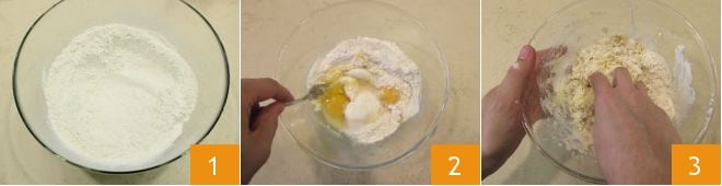 Pour préparer les bonbons à la ricotta et aux épinards, commencez par la Pâtes fraîches aux œufs (feuilletage et formats). Dans un bol, versez la farine, en gardant environ 50 g de côté à ajouter si nécessaire 1 ; puis ajoutez les œufs 2 et mélangez le tout dans le même bol 3. Lorsque les œufs sont absorbés, vous pouvez continuer sur un plan de travail et pétrir la pâte jusqu'à ce qu'elle soit lisse et élastique.
