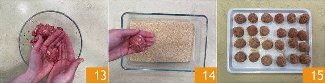Prenez une portion de pâte et formez les boulettes 13, passez-les dans la chapelure 14 et placez-les sur un plateau 15.