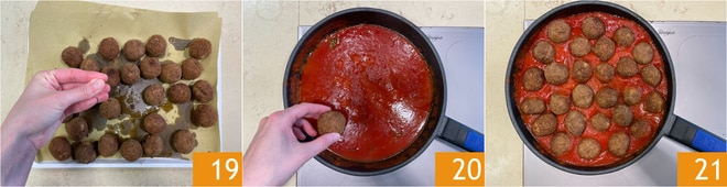 Salez 19 lorsqu'elles sont encore chaudes. Pendant ce temps, la sauce sera prête, plongez-y les boulettes frites 20, en les disposant côte à côte 21.