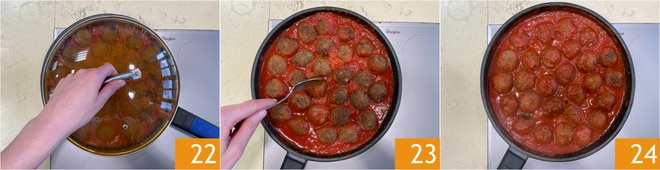 Couvrez avec le couvercle 22 et faites cuire pendant 10 minutes, en les retournant toutes les 2-3 minutes 23. Les boulettes à la sauce de grand-mère sont prêtes 24, servez-les avec du pain grillé.
