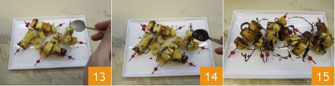 Vous pouvez servir les brochettes de panettone avec les deux fondues à côté dans des petits bols séparés ou les décorer directement en faisant couler la fondue de chocolat blanc 13 et noir 14 dessus. Les brochettes de panettone avec fondue aux deux chocolats sont maintenant prêtes à être apportées à la table des fêtes pour régaler vos invités 15 !