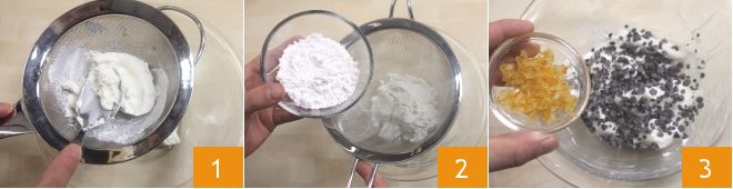 Pour préparer le café à la cassata, tamisez la ricotta avec une passoire 1, ajoutez-y le sucre glace 2, tamisé lui aussi, et mélangez le tout avec des mouvements amples et rapides, pour monter le mélange. Ajoutez les pépites de chocolat et les fruits confits 3,