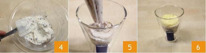 puis mélangez bien pour amalgamer tous les ingrédients 4. Transférez la crème obtenue dans une poche à douille et disposez-la au fond de quatre verres moyens en verre 5. Pendant ce temps, préparez le génoise (suivant la recette que vous trouverez Génoise) et laissez-la refroidir. À ce stade, prenez la génoise et coupez-la horizontalement en deux, pour obtenir deux disques. Dans l'un des disques, découpez-en quatre avec un diamètre de 6 cm, en utilisant un emporte-pièce rond. Disposez un disque de génoise dans chaque verre et placez le tout au réfrigérateur pour reposer quelques heures.