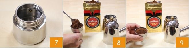 Préparez maintenant le café en utilisant une cafetière. Pour obtenir un excellent café, remplissez la chaudière de votre cafetière avec de l'eau froide, si possible pauvre en calcaire, en prenant soin de ne pas dépasser la soupape de sécurité 7 (sinon vous obtiendrez un café plus long). Remplissez le filtre avec le café moulu en formant une "petite montagne" 8, que vous nivelerez en tapant le filtre sur la table avec des mouvements décidés 9. Ne pressez pas avec la cuillère, ni ne faites de trous à la surface.