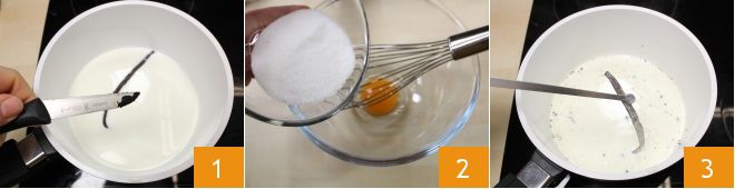 Pour préparer le café meringué, commencez par préparer la crème pâtissière : chauffez le lait dans une casserole avec la moitié d'une gousse de vanille et ses graines 1. Battez dans un bol, avec le fouet, le jaune d'œuf et le sucre 2 puis ajoutez la farine. Avec une pince, retirez la gousse 3 et