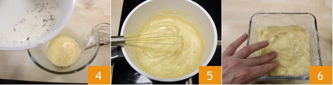 versez le lait chauffé sur le mélange en un filet continu 4, en mélangeant avec le fouet. Remettez le mélange sur le feu et remuez continuellement jusqu'à ce que la crème ait épaissi 5. Transférez la crème pâtissière dans un bol et laissez-la refroidir en la conservant avec un film plastique en contact 6.