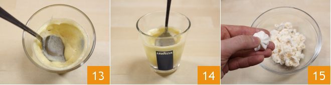Pendant que le café est sur le feu, mettez dans chaque petit verre 30 g de crème pâtissière bien froide et étalez-la sur le fond et les côtés du verre, jusqu'à recouvrir les 3/4 de hauteur du verre lui-même (13-14). Émiettez avec les mains les meringues en morceaux plutôt grands 15.