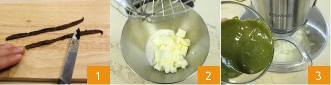 Pour préparer le cake à la pistache, commencez par prendre la gousse de vanille, ouvrez-la en deux, extrayez-en les graines et mettez-les de côté 1; alternativement, vous pouvez utiliser un sachet de vanilline. Mettez dans le bol d'un robot pâtissier, équipé d'un fouet, le beurre à température ambiante avec le sucre 2 et mélangez le tout en activant la machine. Avec le robot en marche, ajoutez également les graines de la gousse de vanille au mélange de beurre et de sucre, puis incorporez la pâte de pistache 3 (si vous ne trouvez pas de pâte de pistache, vous pouvez la réaliser vous-même en mixant finement les pistaches pelées),
