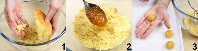Pour préparer les cake pops, commencez par vous procurer 400 g de génoise, sinon vous pouvez utiliser notre gâteau 7 pots, le gâteau au chocolat ou utiliser des restes de gâteau ou des gâteaux industriels (comme un quatre-quarts). Émiettez le gâteau avec les doigts, en retirant éventuellement la croûte si elle est trop sèche, et mettez les miettes dans un bol 1. À ce stade, ajoutez environ 4 cuillères à soupe de votre confiture préférée (une à la fois) 2, pétrissant à la main jusqu'à obtenir une pâte assez compacte pour former des "petites boules". Je vous conseille d'ajouter les deux premières cuillères de confiture, de pétrir et ensuite, seulement si nécessaire, d'ajouter une troisième ou éventuellement une quatrième cuillère. Formez avec la pâte des boules un peu plus petites qu'une noix, posez-les sur une feuille de papier sulfurisé et laissez-les raffermir au congélateur pendant environ une demi-heure 3.