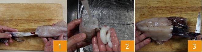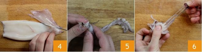 Pour préparer les calamars farcis de scarole, commencez par nettoyer les calamars (vous pouvez consulter la fiche de l'École de cuisine : Comment nettoyer les calamars). Après avoir lavé les calamars sous l'eau courante, détachez délicatement la tête du manteau avec les mains et mettez-la de côté 1. Toujours avec les mains, cherchez la plume de cartilage transparent qui se trouve dans le manteau et retirez-la délicatement. Passez à nouveau le calamar sous l'eau courante, lavez-le soigneusement et aidez-vous avec les mains pour extraire les entrailles du manteau et le sac d'encre s'il est présent 2. Passez ensuite à l'élimination de la peau extérieure : incisez avec un couteau la partie finale du manteau, juste assez pour saisir un bord de la peau 5 et retirez entièrement le revêtement avec les mains ou en vous aidant d'un couteau 6.