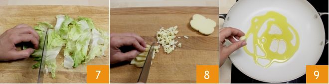 Lavez la scarole, puis coupez grossièrement les feuilles 7, en éliminant la partie du trognon. Ensuite, coupez également le fromage provola en dés 8. Préparez également les olives (si vous n'avez pas d'olives dénoyautées, vous pouvez retirer le noyau en vous aidant d'un couteau). Dans une poêle, chauffez un filet d'huile et ajoutez la gousse d'ail épluchée 9.