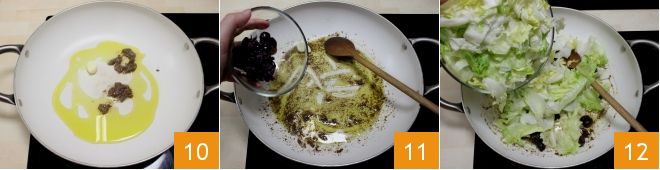 Ensuite, ajoutez les filets d'anchois 10 et faites-les fondre à feu doux en remuant avec une cuillère en bois. Puis ajoutez les olives dénoyautées 11 et la scarole 12.