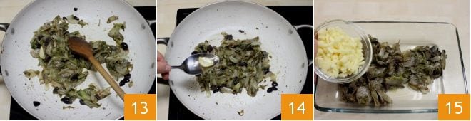 Salez et poivrez, mélangez 13 et laissez cuire pendant 20 minutes, jusqu'à ce que la scarole soit flétrie et bien assaisonnée. Ensuite, éteignez le feu, retirez l'ail de la poêle 14 et transférez la scarole dans un saladier pour la laisser refroidir. Lorsqu'elle sera froide, ajoutez le fromage provola en dés 15 et mélangez les ingrédients de la farce.