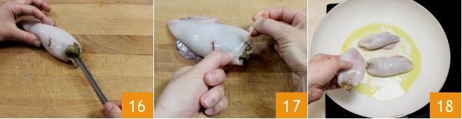 Maintenant, vous pouvez commencer à farcir les calamars. Avec une cuillère, versez la farce dans chaque calamar et aidez-vous de pinces pour bien remplir le manteau jusqu'au fond 16. Ensuite, fermez le calamar avec un cure-dent en le faisant passer entre les bords du manteau 17. Prenez une grande poêle et faites chauffer un filet d'huile. Ajoutez les calamars pour les faire cuire des deux côtés.