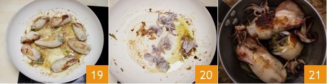 Faites-les cuire pendant environ 20 minutes à feu moyen 19, en les retournant souvent. Lorsqu'ils seront cuits, retirez-les de la poêle et laissez le fond de cuisson dans lequel vous pourrez cuire les têtes que vous aviez précédemment nettoyées 20 pendant une dizaine de minutes. Ensuite, éteignez le feu et servez les têtes avec les calamars farcis de scarole 21 !