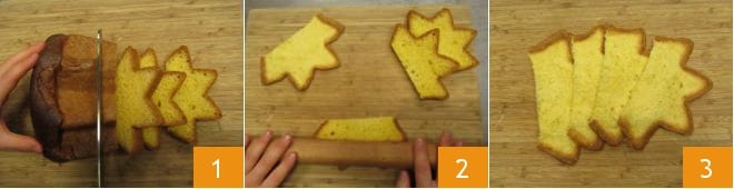 Pour réaliser le cannoli de pandoro et Nutella®, coupez 8 tranches de 1 cm chacune dans la moitié d'un pandoro restant (en prenant soin d'enlever la partie du sommet) 1. Pressez-les légèrement avec un rouleau à pâtisserie pour obtenir une épaisseur de 0,5 cm (2-3).