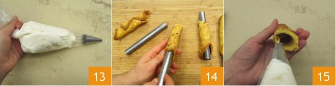 Transférez la crème dans une poche à douille avec une douille en étoile 13. Reprenez les cannolis, retirez-les délicatement du tube 14 et garnissez-les d'abord avec la crème au mascarpone en la pressant d'un côté 15