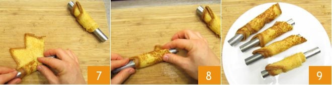 Au fur et à mesure que vous grillez les tranches, enroulez-les encore chaudes autour d'un tube à cannoli d'un diamètre d'environ 1 cm 7, en faisant bien adhérer les extrémités avec une légère pression 8. Placez les cannolis au réfrigérateur pour les raffermir pendant 15 minutes 9.