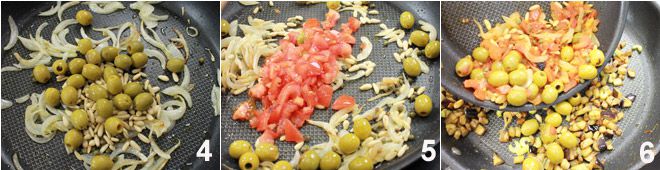 Lavez et coupez les aubergines en petits cubes et disposez-les dans une passoire en les saupoudrant de gros sel. Laissez reposer ainsi pendant environ une heure, afin qu'elles perdent leur eau de végétation 1. Pendant ce temps, coupez les branches de céleri en fines lamelles et blanchissez-les dans de l'eau salée, puis égouttez-les, séchez-les et faites-les revenir dans l'huile à feu doux 2. Émincez l'oignon et coupez les tomates en cubes 3.