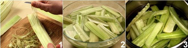 Commencez la préparation des cardons à l'étouffée en nettoyant le légume de cette manière : coupez la partie finale de la botte de cardons et détachez chaque côte en éliminant les feuilles. Si les côtes de cardon sont trop larges, coupez-les en deux dans le sens de la longueur, puis à l'aide d'un couteau, incisez une extrémité et tirez dans le sens opposé 1 pour éliminer ainsi les filaments. Répétez l'opération en commençant par l'extrémité opposée. Une fois tous les filaments éliminés, coupez le cardon en morceaux d'environ 15 cm que vous placerez dans un bol d'eau acidulée 2 (c'est-à-dire avec l'ajout du jus d'un citron), afin qu'ils ne noircissent pas. Lorsque vous aurez nettoyé et coupé tous les cardons, rincez-les sous l'eau froide courante et faites-les cuire à l'eau 3 en les plaçant dans une casserole remplie d'eau avec une cuillère à soupe de gros sel pendant environ 15 minutes s'il s'agit d'une cocotte-minute ou environ 25-30 minutes en les cuisant de manière traditionnelle.