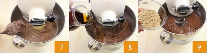 Quand tous les œufs seront absorbés, ajoutez une cuillère à la fois les poudres tamisées 7, jusqu'à obtenir une pâte homogène et crémeuse. Versez la bière en filet 8, toujours avec le robot en action. Enfin, ajoutez les pignons de pin 9 et travaillez la pâte encore quelques minutes.